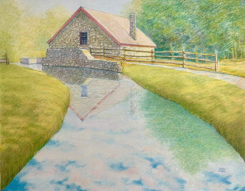 In conclusion, deciding what to include or to exclude in the landscape surrounding a familiar landmark can be challenging. In my drawings of the Sudbury grist mill, my goal was to highlight the unique rock construction that has caused so many artists, historians and tourists to visit and record this structure. I wanted to lead the viewers to the building by the clearest path possible and provide enough details to make them linger. Therefore, I opted to follow my instincts and depart from the reference photographs.