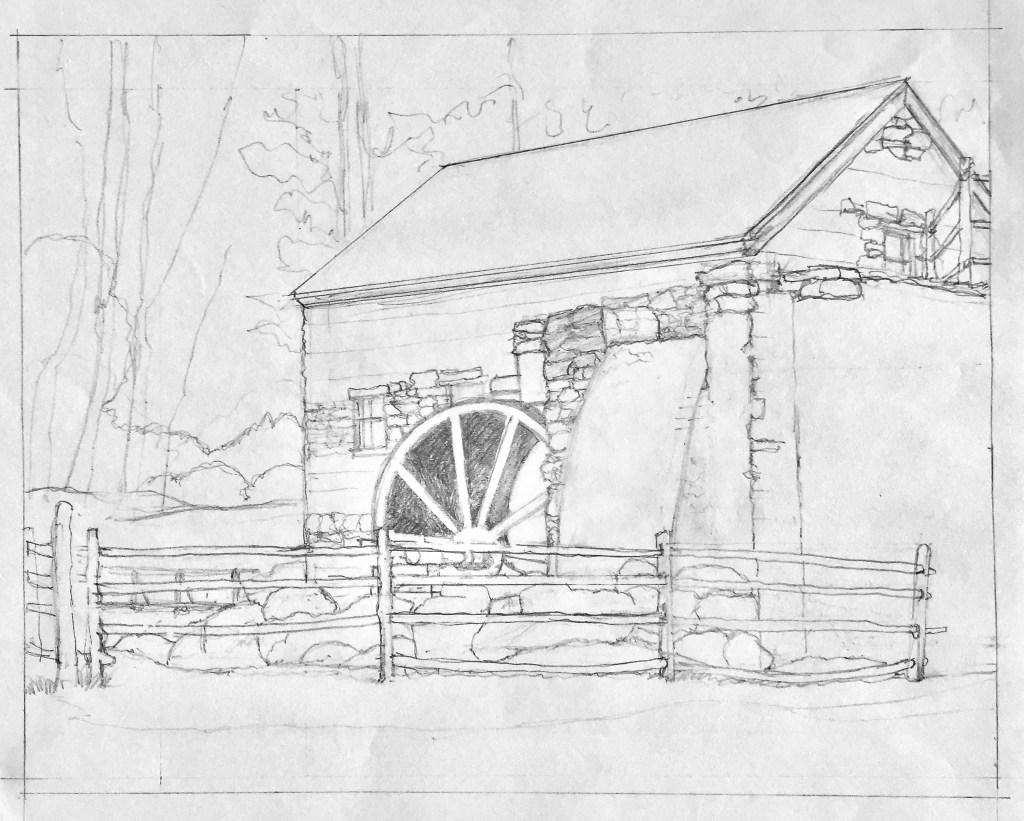I began with a pencil sketch to establish a composition. I worked from my own photograph and chose a slightly different angle than the collection of existing images I had researched. After transferring the line drawing, I filled the composition with base colors. I like to cover the surface to evaluate how colors will work together before I commit to darker values. I concentrated on the water wheel initially. It is the focal point because of its dominant color and because it defines the purpose of the building. All the other values and textures, I decided, would be subordinate to the contrasts in the wheel.
