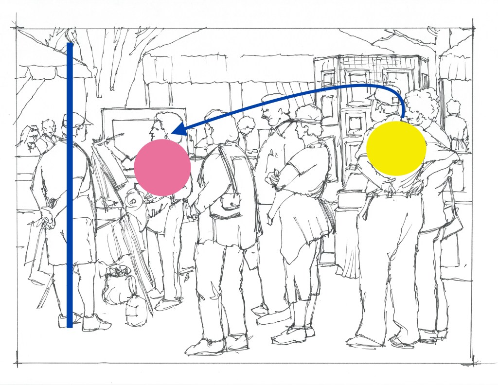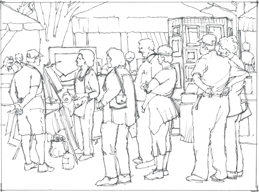 I filled the remainder of the frame with onlookers, and I placed the tallest figures on the right and decreased their sizes to lead the eye leftward.To return the eye into the composition, I placed another observer, the man with his hands clasped behind him. I placed the background tree as a subtle visual stop. I added a couple in the background left to return the eye into the rectangle. Between the figures, I suggested displays, tables, a grove of trees, and the tents common at outdoor art fairs. All of these elements were designed to move the eye to the artist.